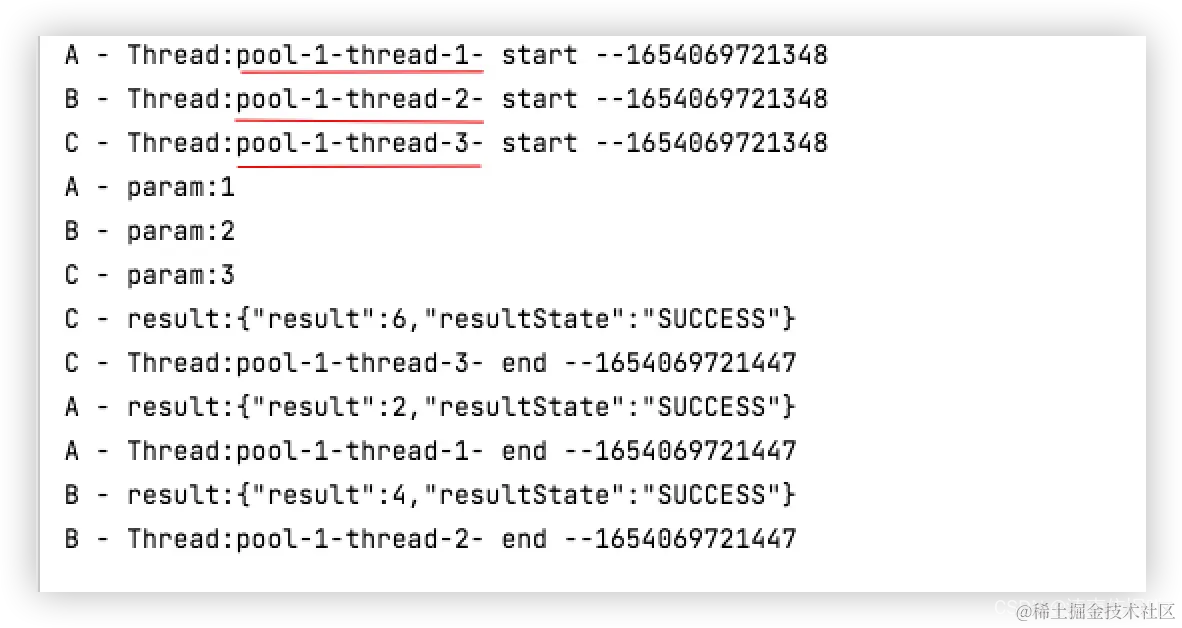 Worker的定义如下,实现IWorker,ICallback函数式接口,并重写下面的4个方法。4个方法的说明如下: Worker的定义如下,实现IWorker,ICallback函数式接口,并重写下面的4个方法。4个方法的说明如下: 1、begin():Worker开始执行前,先回调begin()。 2、action():Worker中执行耗时操作的地方,比如RPC接口调用。 3、result():action()执行完毕后,回调result方法,可以在此处处理action中的返回值。 4、defaultValue():整个Worker执行异常,或者超时,会回调defaultValue(),Worker返回默认值。 如果没有实现ICallback,会默认执行DefaultCallback的回调方法。DefaultCallback是一个空的回调,里面没有任何逻辑。 5、通过执行器类Async的beginWork方法提交任务执行。