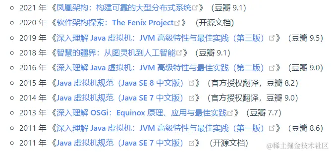 这可是真大佬,或许有些朋友没有听过,但是你们一定听过:《深入理解 Java 虚拟机》这本神书,没错就是这本书的作者,出过多本书,豆瓣评分如下,全是高分,尤其是《深入理解Java虚拟机》,是JVM中的巅峰之作,如果要学JVM的,看这本就可以了,其他的都可以扔了。