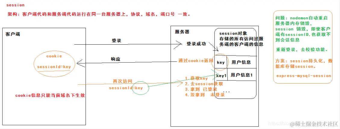 cookie有效范围:当前域名下有效。所以session这种会话存储方式方式只适用于客户端代码和服务端代码运行在同一台服务器上(前后端项目协议、域名、端口号都一致,即在一个项目下)