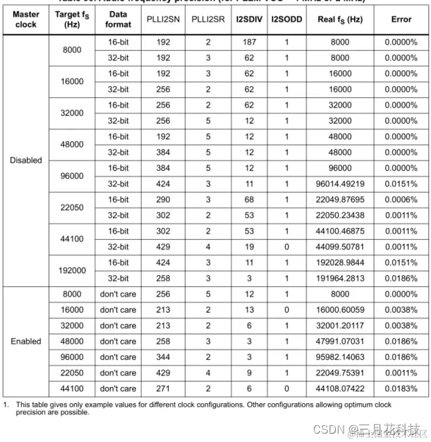 这里的时钟配置对我有很大的启发,对应f4的芯片对应i2s的时钟配置必须是按照这样固定的,否则音质一定会打折扣。