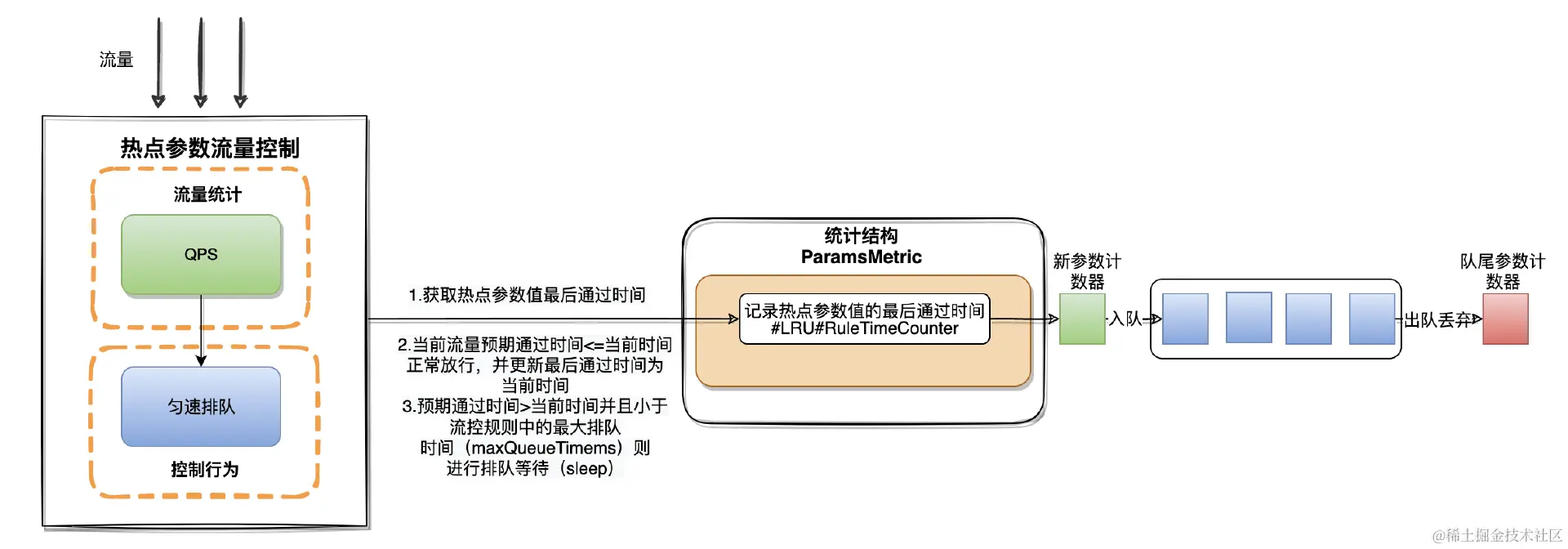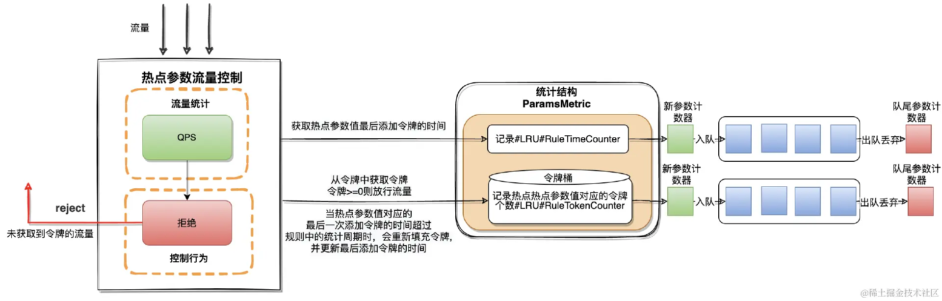- 首先当流量请求经过时会到统计结构(ParamsMetric)中的RuleTimeCounter(LRU)中获取当前参数值最后一次通过的时间