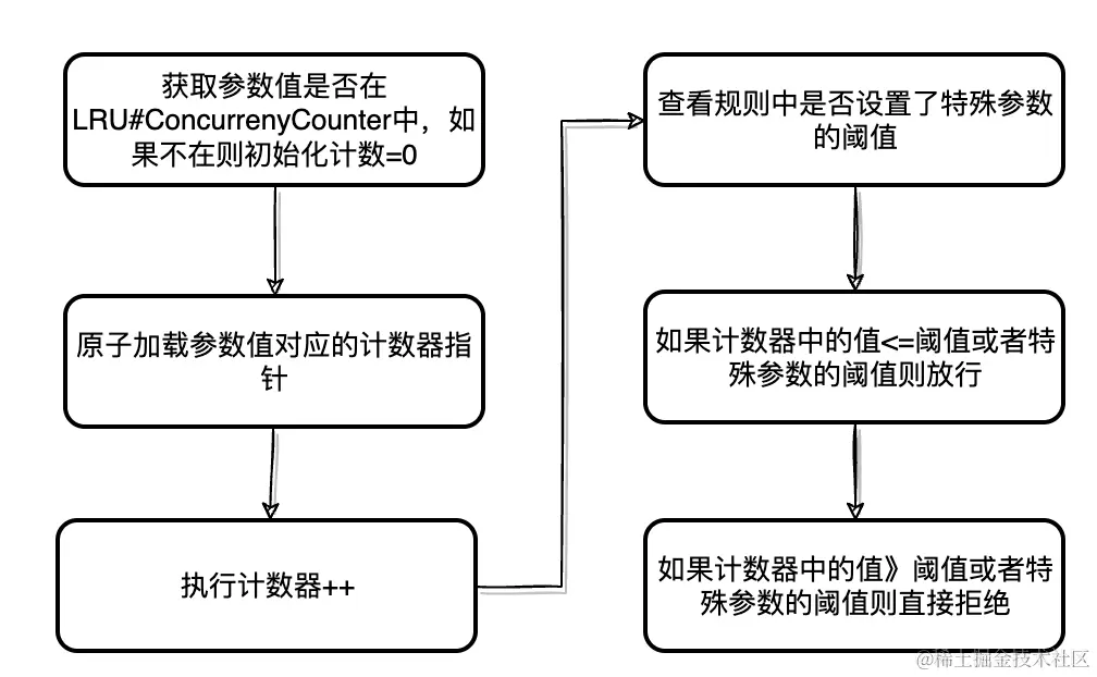 并发超过阈值直接拒绝的流程比较简单,只需要用到统计结构(ParamsMetric)中的ConcurrencyCounter来记录热点参数值的并发数量即可,如下: