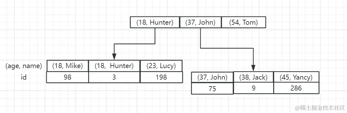 根据上图可以看到非叶子结点的值由两部分组成,分别是 age 和 name 的值,那么我们在进行查询的时候,也应该遵循这个顺序才可能使得索引生效。