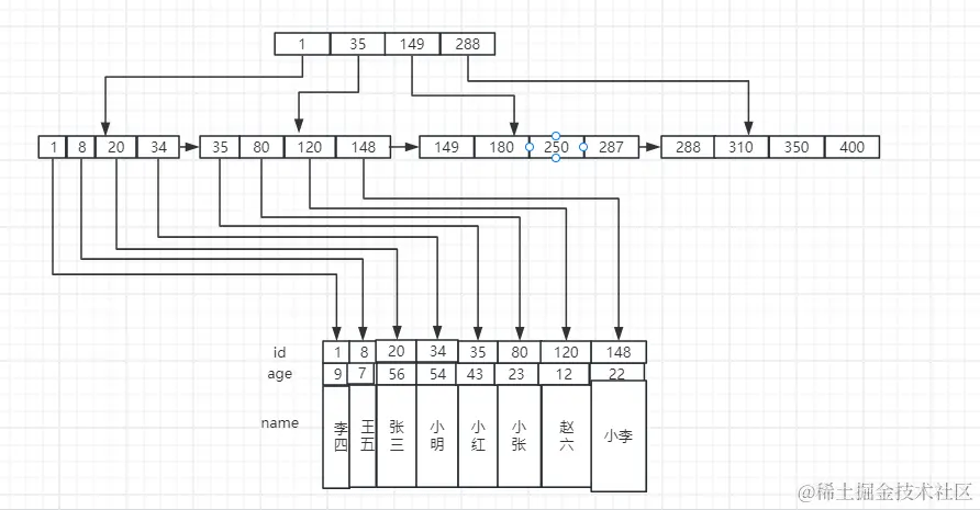 与二叉树一样,B+ 树也是一种树结构,与之不同的点在于每一层并非只有左右两个子结点,而是可以有多个结点,而在 InnoDB 中,数据都是存储在叶子结点上,现在假设我们有一张 user 表,以 id 为主键,有 name、age 这两个字段,那么数据的存储示意图则如下: