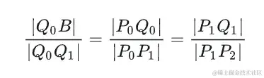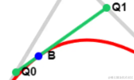 接着我们再将Q0、Q1相连,就能得到上图中的绿色线Q0Q1,在这条线上我们再取一个点B,点B也要满足上述规律: