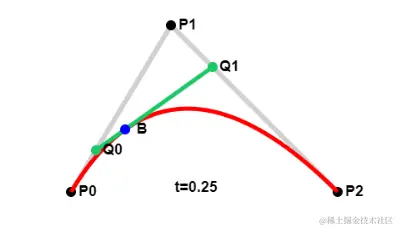 这三个控制点就分别构成了两条灰色的线P0P1和P1P2。现在我们从两条线上各选取一个点即Q0、Q1。Q0、Q1需要满足以下的公式: