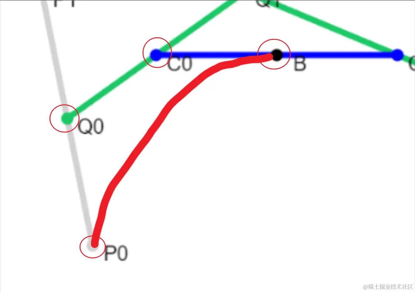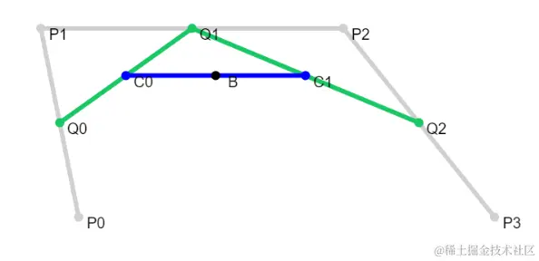 最后,我们要绘制从P0到B的弧线,但是这条弧线是不能随意绘制的,它实际上也是一条三次贝塞尔曲线,控制点为Q0和C0。