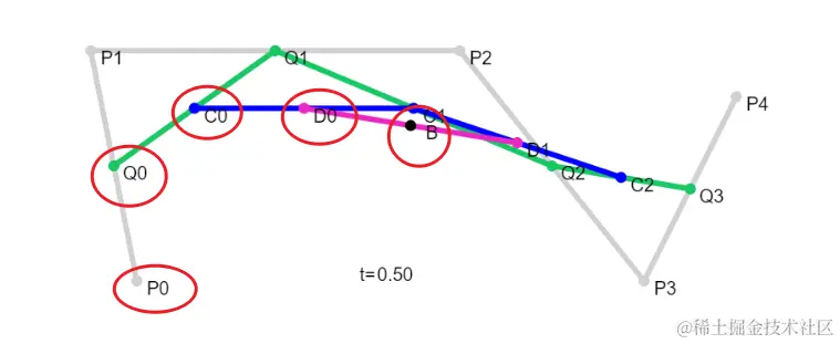 这里我就以四次贝塞尔曲线为例,此时我们同样是要绘制从P0到B点的弧线,这个弧线是一条以Q0、C0、D0为控制点的四次贝塞尔曲线。