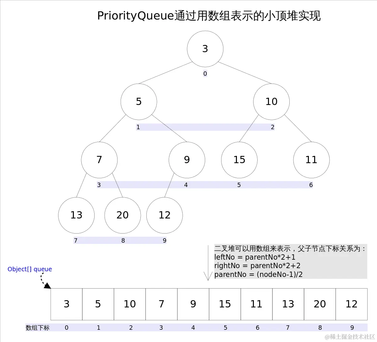 通过数组表示的小顶堆实现。小顶堆父子节点下标关系: