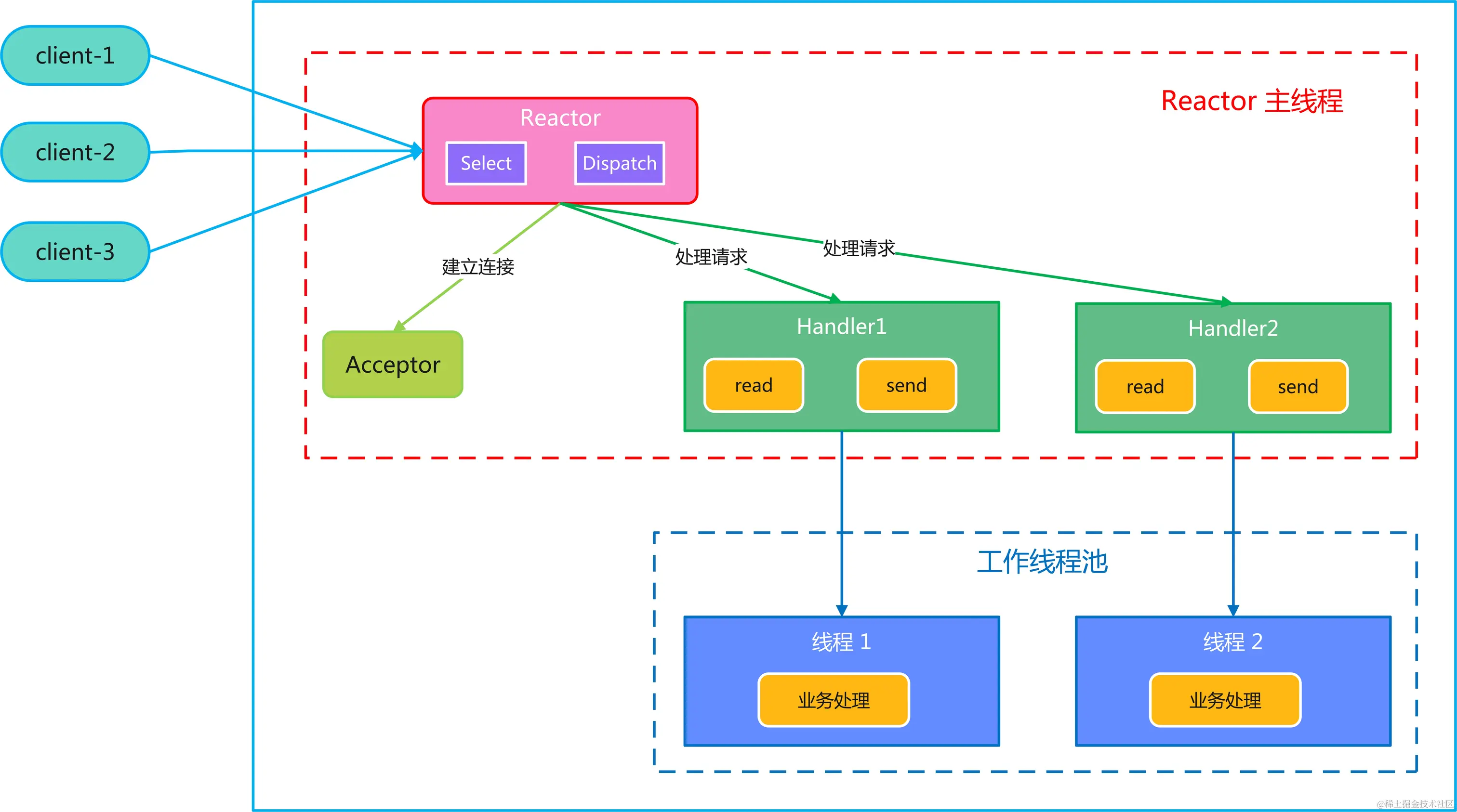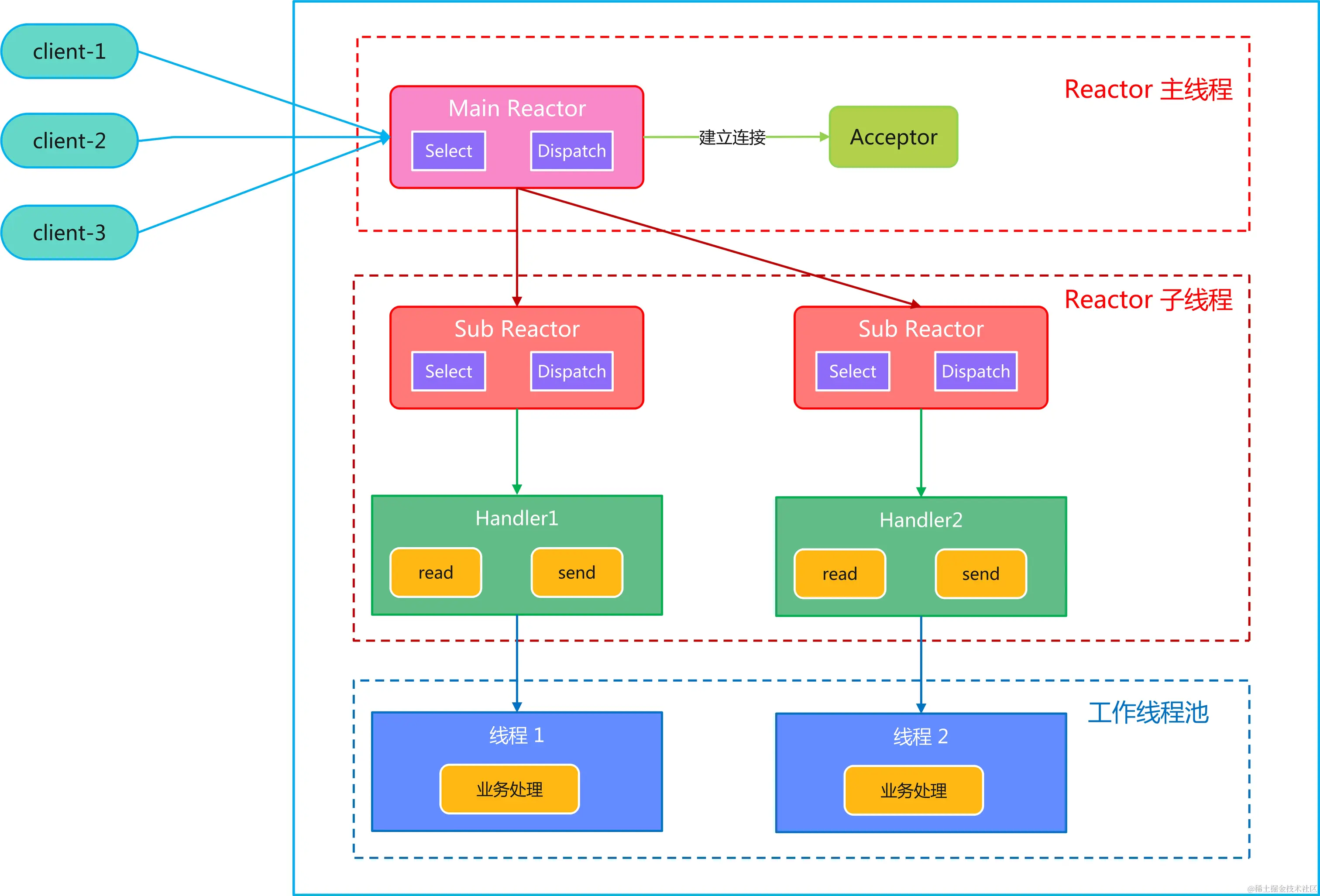- 主线程中的 MainReactor 对象通过 select 监听事件,接收到事件后通过 Dispatch 进行分发,如果事件类型为建立连接则将事件分发给 Acceptor 进行连接建立