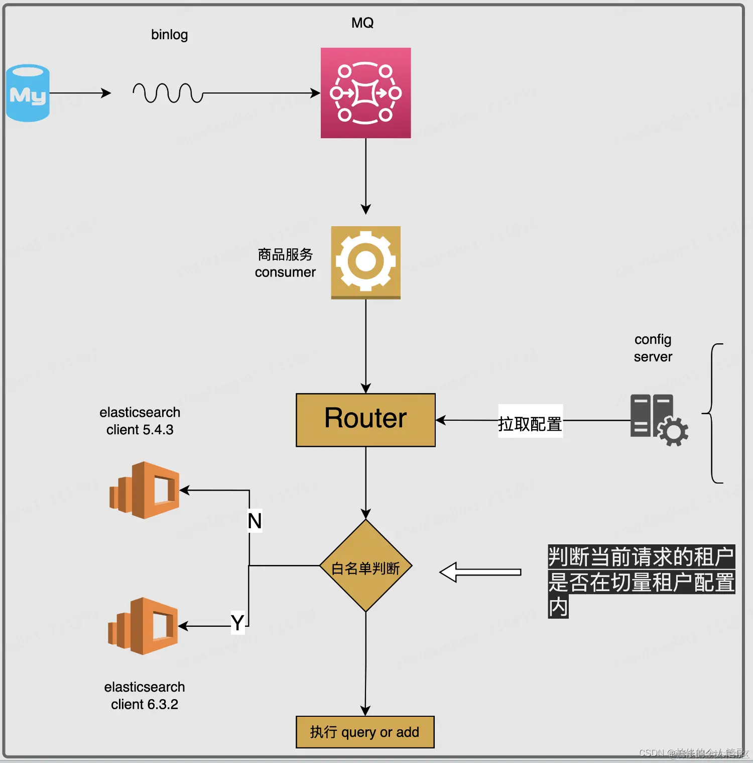 核心的思路是通过线上configServer配置来完成租户白名单控制,如果在白名单内我们将通过切到 es 6.0 client 来实现新集群切量.这样一来就能够做到线上的无缝切量以及即时的回退.