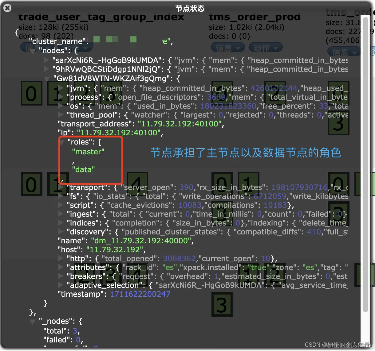 从以上的节点拓扑以及系统查看可知,目前的 ES 4个节点均为主节点&数据节点.