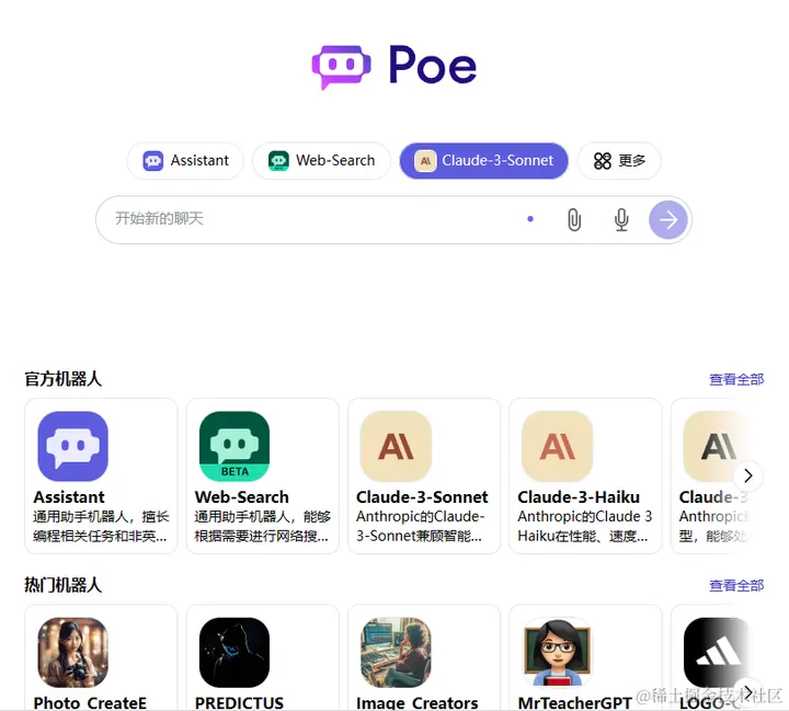 Poe是来自 Quora 的对话式人工智能聊天机器人,可供用户随意访问。注册后可以选择Claude-3-Sonnet等免费模型,每日送3000积分,GPT4和Claude3Opus需要订阅。