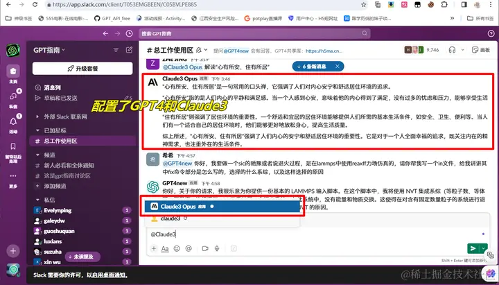 大佬通过Claude官网的API在Slack配置的一个应用,加入他的Slack工作区就能直接使用Claude3模型。而且工作区里面还有GPT4可以使用。目前Slack可以在电脑、手机、网页使用,可以说是很方便了。