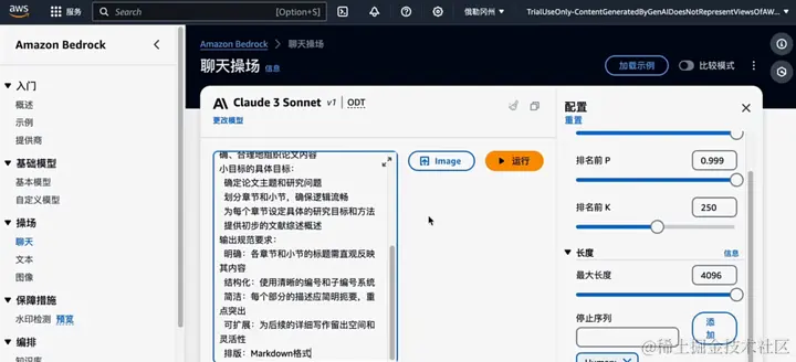 目前,Amazon Bedrock 控制台提供试用 Anthropic Claude 3 Sonnet 模型,可以免费白嫖1天的使用权限。具体操作方式也简单!