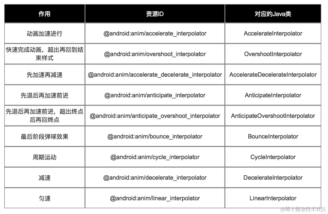 - public void setInterpolator(Interpolator i) // 插值器,即影响动画的播放速度