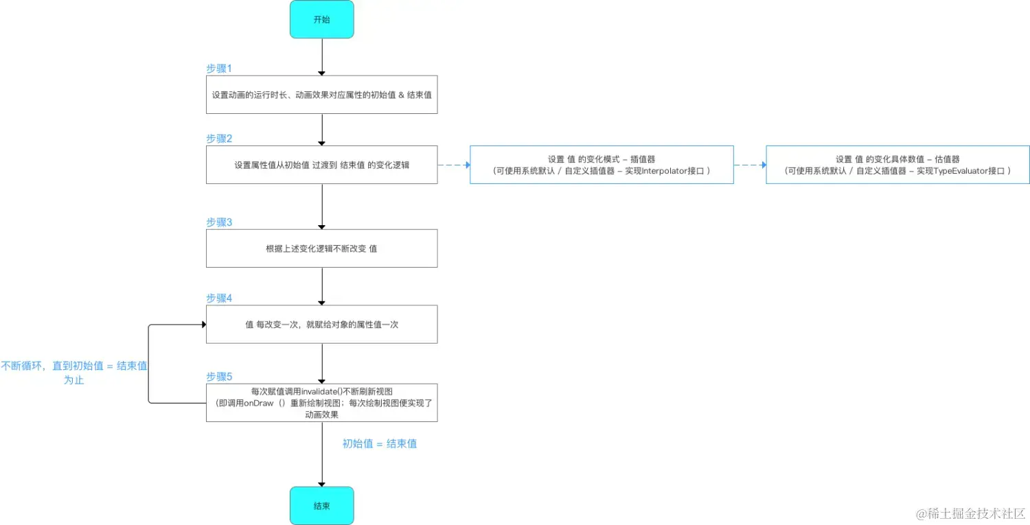属性动画是通过在一定时间间隔内不断对值进行改变和将该值赋值给对象,实现从对象属性上产生动画效果。