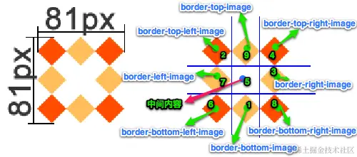 这张图片将会被“切割”成九宫格形式,然后进行平铺。四个角位置、形状保持不变,中心位置和水平垂直向两个方向平铺: