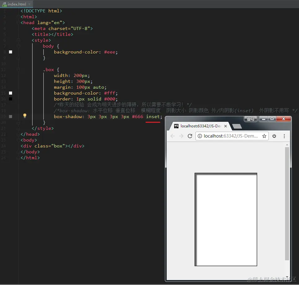 另外,后面还可以再加一个inset属性,表示内阴影。如果不写,则默认表示外阴影。例如: