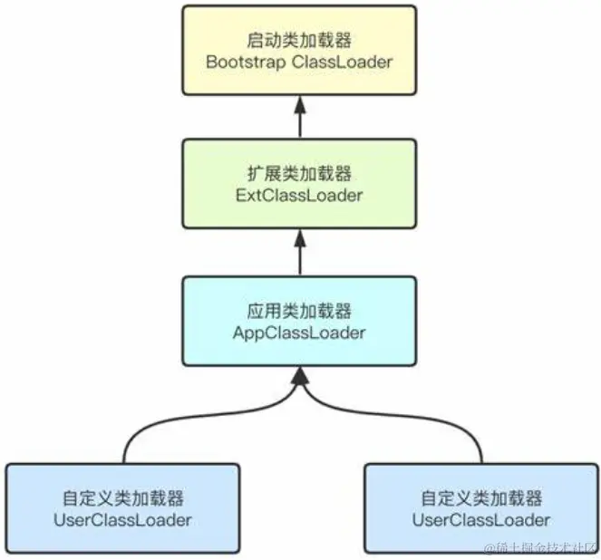 - user classloader(用户自定义类加载器):用户自定义的类加载器,可加载指定路径的class文件