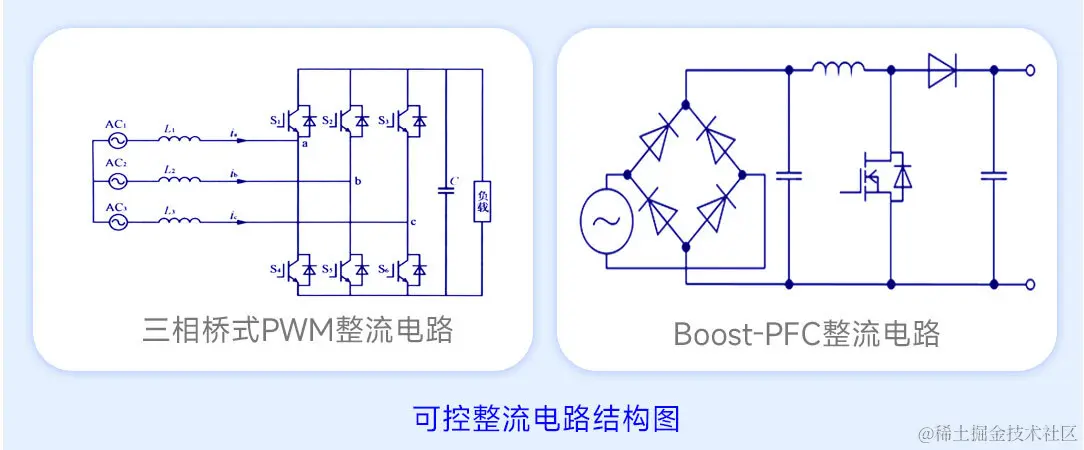 可控整流采用的功率器件均为可控器件,如晶闸管、IGBT等。可控整流电路可以通过开关器件的导通、关断来调节整流输出电压大小。常用的可控整流电路有三相桥式PWM整流电路与Boost-PFC整流电路,其电路结构见下图。