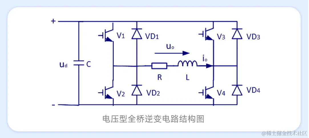 与整流相对应,直流-交流变换又称为逆变。当交流侧接有电源时(接入电网)为有源逆变,交流侧直接连接负载时为无源逆变。实际应用中,常用的逆变电路为全桥逆变电路,电压型全桥逆变电路的结构如图所示。