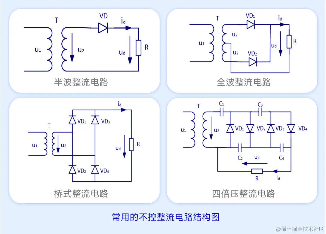 根据电源与负载的电力类型,电力变换分为交流变直流(AC-DC)、直流变交流(DC-AC)、直流变直流(DC-DC)以及交流变交流(AC-AC)四类。那么,它们之间到底是如何变换的呢?
