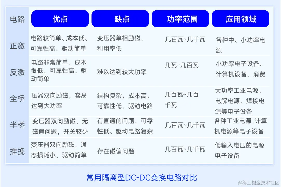 各类隔离型DC-DC变换电路的优缺点、功率范围以及应用领域如表所示。