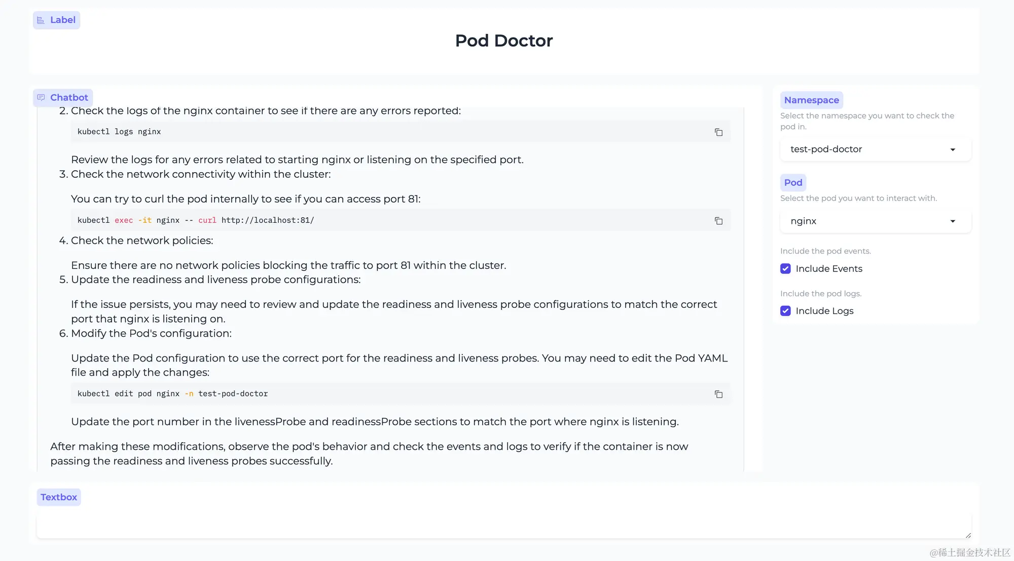 通过结合Gradio的强大功能来构建用户界面,Kubernetes Python 库 来与 Kubernetes Pod 交互,以及 GPT-4 的高级语言理解能力,Pod Doctor 应用程序提供了一种强大且直观的方式来与 Kubernetes Pod 交互并对其进行故障排除。