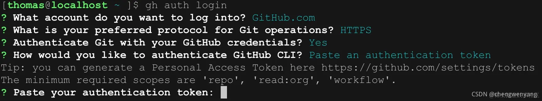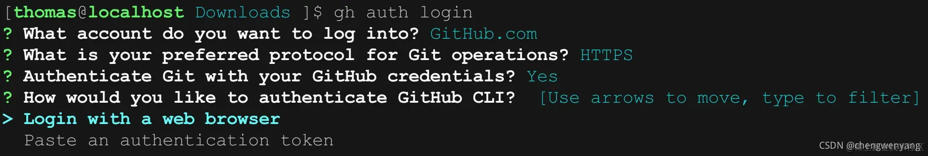 选择使用网页浏览器认证或者粘贴 token 认证,二者选择一个即可。如果是 ssh 远程登录,命令行中无法打开远程的浏览器,那么只能选择 token 验证了。