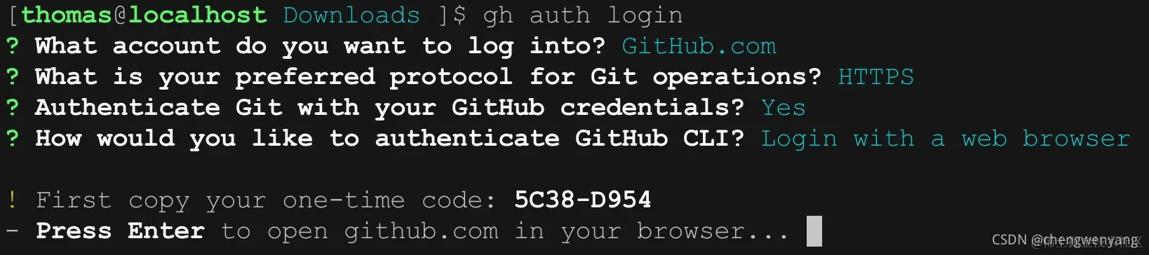 选择使用网页认证:先复制命令行中生成的一次性验证码,比如我这里本次是 5C38-D954。然后回车,自动打开网页浏览器,输入一次性验证码,授权即可完成认证。