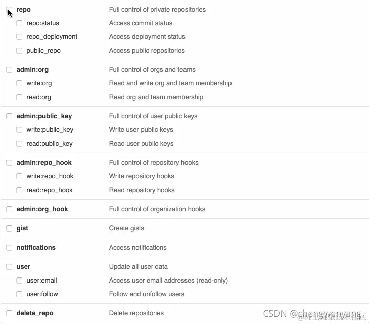为 token 赋予权限。如果从命令行操作仓库,至少选中 repo
