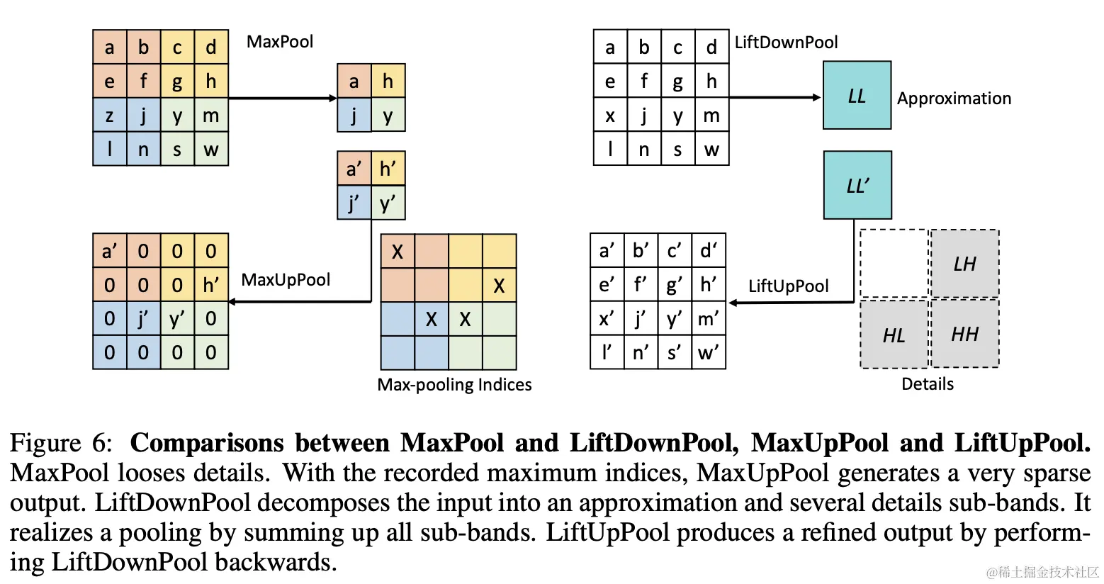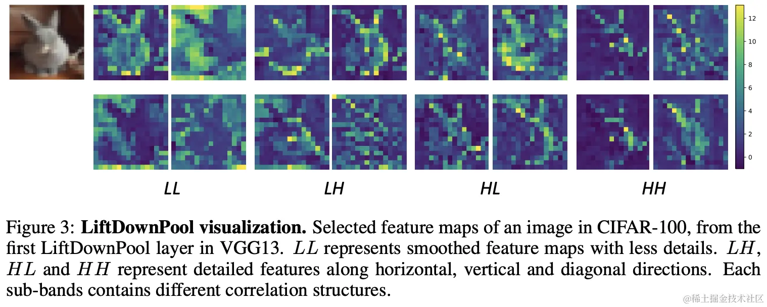 LiftDownPool将特征图分解成次频带LL、LH、HL和HH,其中LL为输入的近似,其它为不同方向的细节信息。LiftDownPool将所有次频带相加作为输出,包含了近似信息和细节信息,能够更高效地用于图像分类。