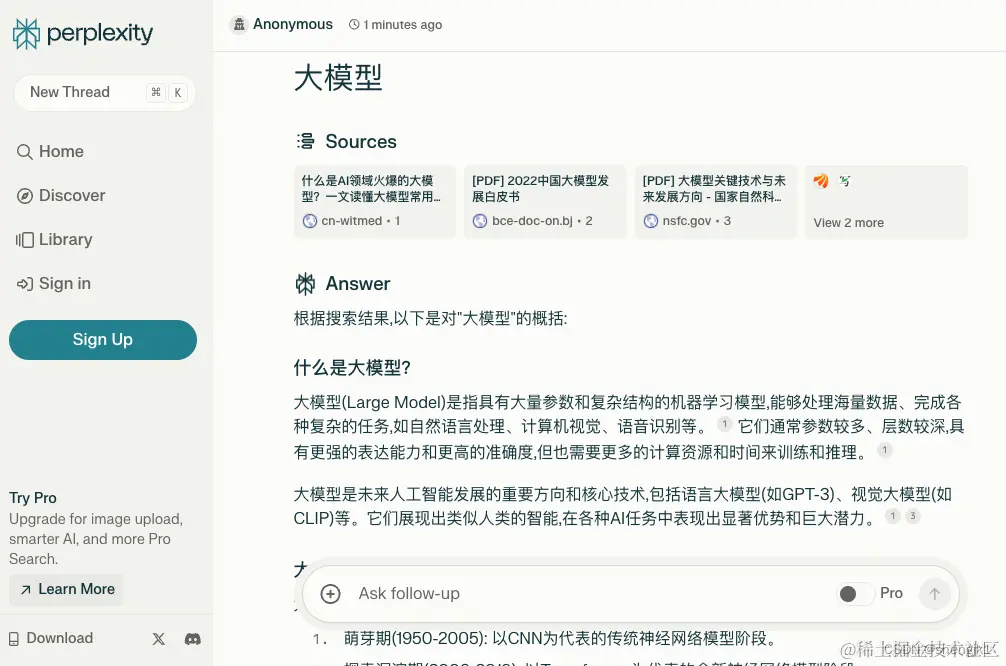 Perplexity AI 提供类似于 Google Search 和 Bing Search 的搜索服务,用户可以用自然语言输入问题,可以获得类似于 ChatGPT 的答案。