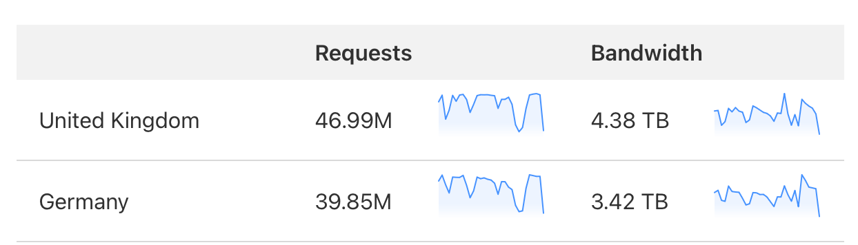DDoS 攻击者们摩拳擦掌,跃跃欲试。他们从四面八方蜂拥而至,誓要用数亿次请求把 TablePlus 的服务器挤爆、搞垮。特别是那些来自德国和英国的流量,简直有如滔滔洪水,一泻千里。短短5天内,他们就发起了 8000 多万次下载请求,妄图耗尽 TablePlus 的带宽和计算资源。