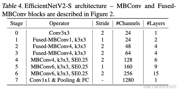 EfficientNetV2-S结构如表4所示,Conv后接的数字是膨胀率。对比EfficientNet,主要有以下区别: