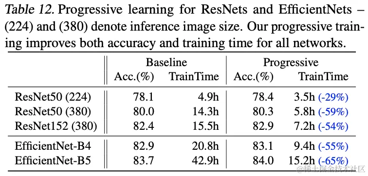 为了验证这个猜想,论文将不同输入图片尺寸和不同正则化强度进行组合测试。从表5的结果来看,基本验证了论文的猜想。于是论文提出了progressive learning,在训练过程中根据动态调整的图片尺寸自适应正则化强度。