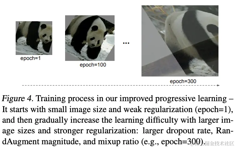 论文提出的progressive learning如图4所示,先用较小的图片尺寸和较弱的正则化进行训练,随后逐步增加图片尺寸和正则化强度。