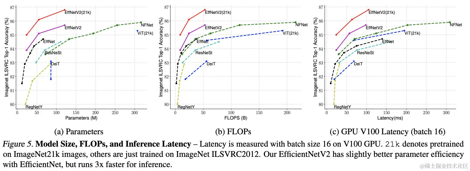 图3对比了各网络的训练耗时,其中EfficientNet有原版和训练时缩小30%图片尺寸的版本,缩小版本的输入尺寸跟EfficientNetV2以及NFNet一致。使用相同训练周期和固定图片尺寸进行训练,EfficientNet仅缩小训练尺寸就能得到很大的性能提升,而EffcientNetV2凭借论文提出training-aware NAS和缩放策略,性能远超其它网络。
