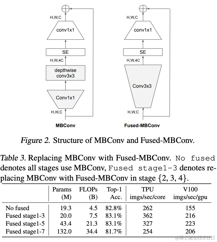 最近有研究提出MBConv的替代结构Fused-MBConv,如图2所示,将depthwise conv3x3和conv1x1合并为常规的conv3x3。为了对比两者的性能差异,论文逐步替换stage进行实验。从表3的结果可以看出,恰当地使用Fused-MBConv可以在不带来过多参数量和计算量的前提下提升训练速度。至于如何是恰当,就靠NAS来自动搜索了。