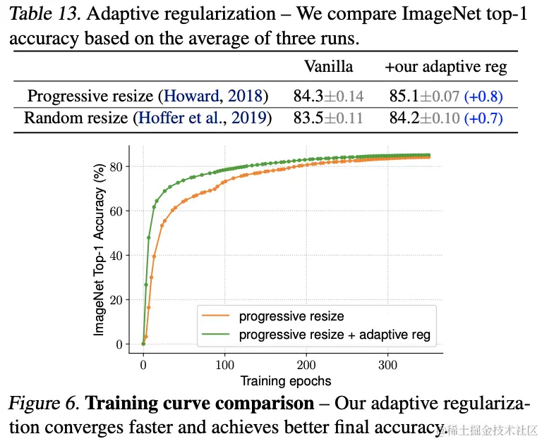 如之前所描述的,图片尺寸对训练效率的影响非常大。除了FixRes,还有很多其他在训练期间动态调整图片尺寸的研究,但这些研究通常都会出现性能下降的情况。论文认为,性能下降的主要原因在于正则化没有匹配动态调整的图片尺寸。较小的输入尺寸应该使用较弱的正则化强度,相反,较大的输入尺寸则应该使用较强的正则化强度。
