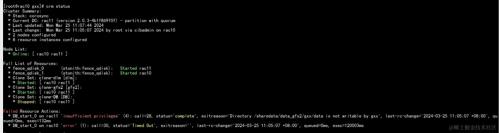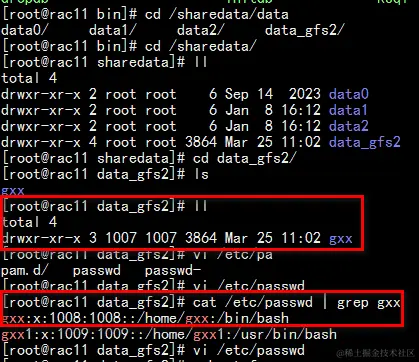 查看对比两个节点上的uid和gid发现,rac10上uid和gid为1007,rac11上为1008(前期rac11上gxx这个用户为删除后再次创建的,所以uid/gid+1)