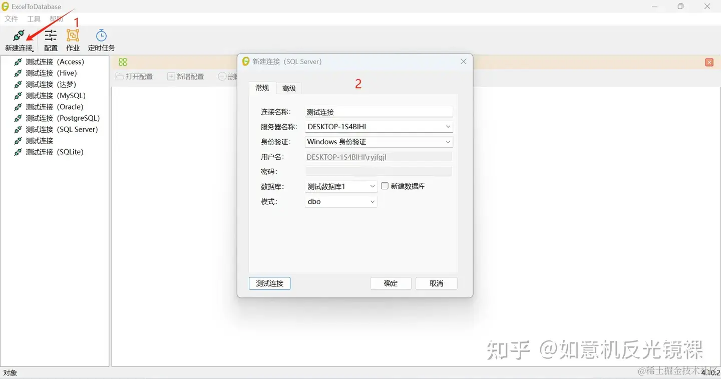 现在,我们通过ExcelToDatabase工具来一键导入到数据库。 第一步:新建一个数据库连接 点击工具栏(新建连接)》选择你的数据库类型,这里以SQL Server为例,新建其他数据库连接,请参考ExcelToDatabase新建数据库连接指南