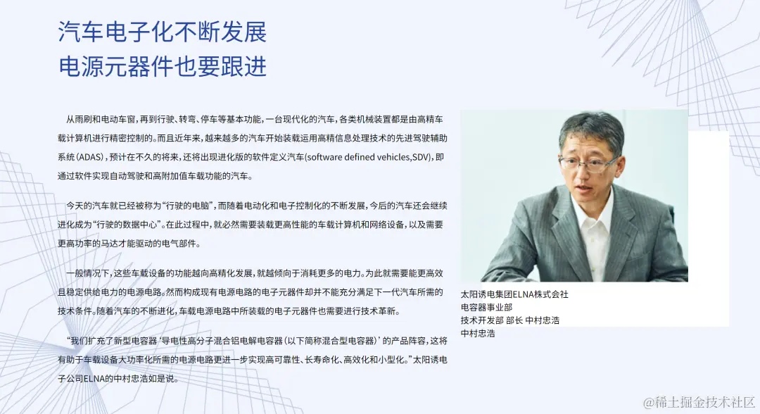 “我们扩充了新型电容器“导电性高分子混合铝电解电容器(以下简称混合型电容器)的产品阵容,这将有助于车载设备大功率化所需的电源电路更进一步实现高可靠性、长寿命化、高效化和小型化。”太阳诱电子公司ELNA的中村忠浩如是说。