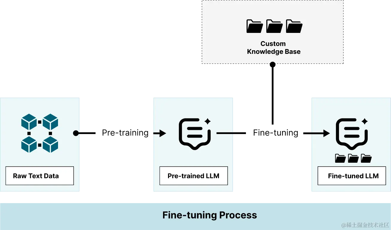 - LLM 通过微调从您的自定义语料库中获取知识。