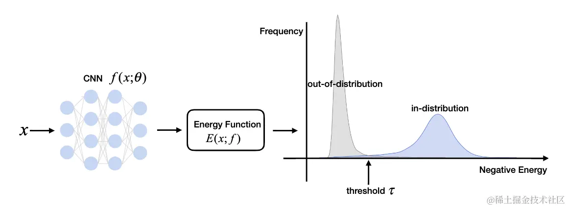 Out-of-distribution detection是个二分类问题,评价函数需要产生一个能够判定ID(in-distribution)数据和OOD(out-of-distribution)数据的分数。因此,论文尝试在分类模型上接入energy函数,通过energy进行OOD检测。energy较小的为ID数据,energy较大的为OOD数据。