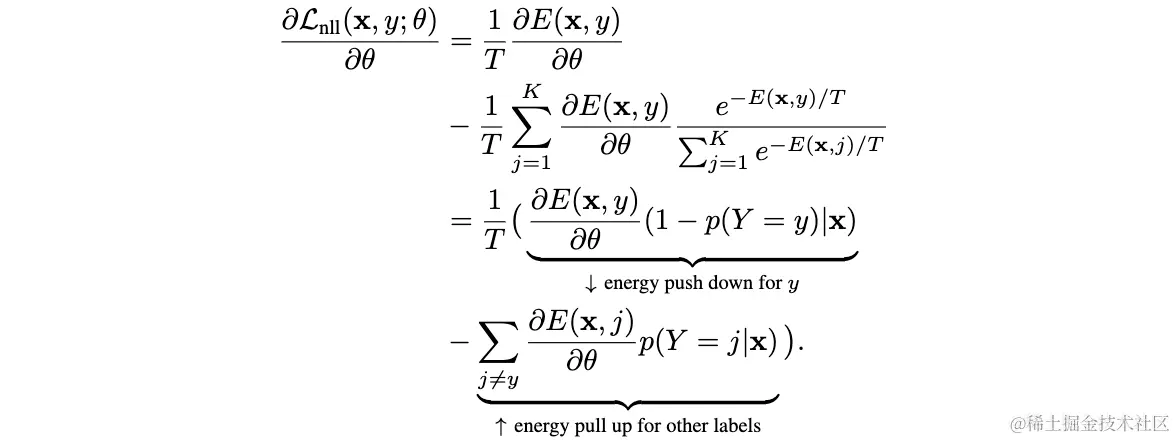 从损失值越低越好的优化角度看,公式6的第一项倾向于拉低目标类别的energy,而公式6第二项从形式来看相当于输入数据的free energy。第二项导致整体损失函数倾向于拉低目标类别的energy,同时拉高其它标签的energy,可以从梯度的角度进行解释:
