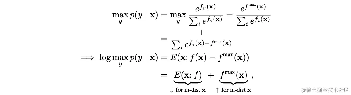 论文先通过公式推导,来证明energy可以简单又高效地在任意训练好的模型上代替softmax置信度。将sofmax置信度进行对数展开,结合公式4以及进行符号转换: