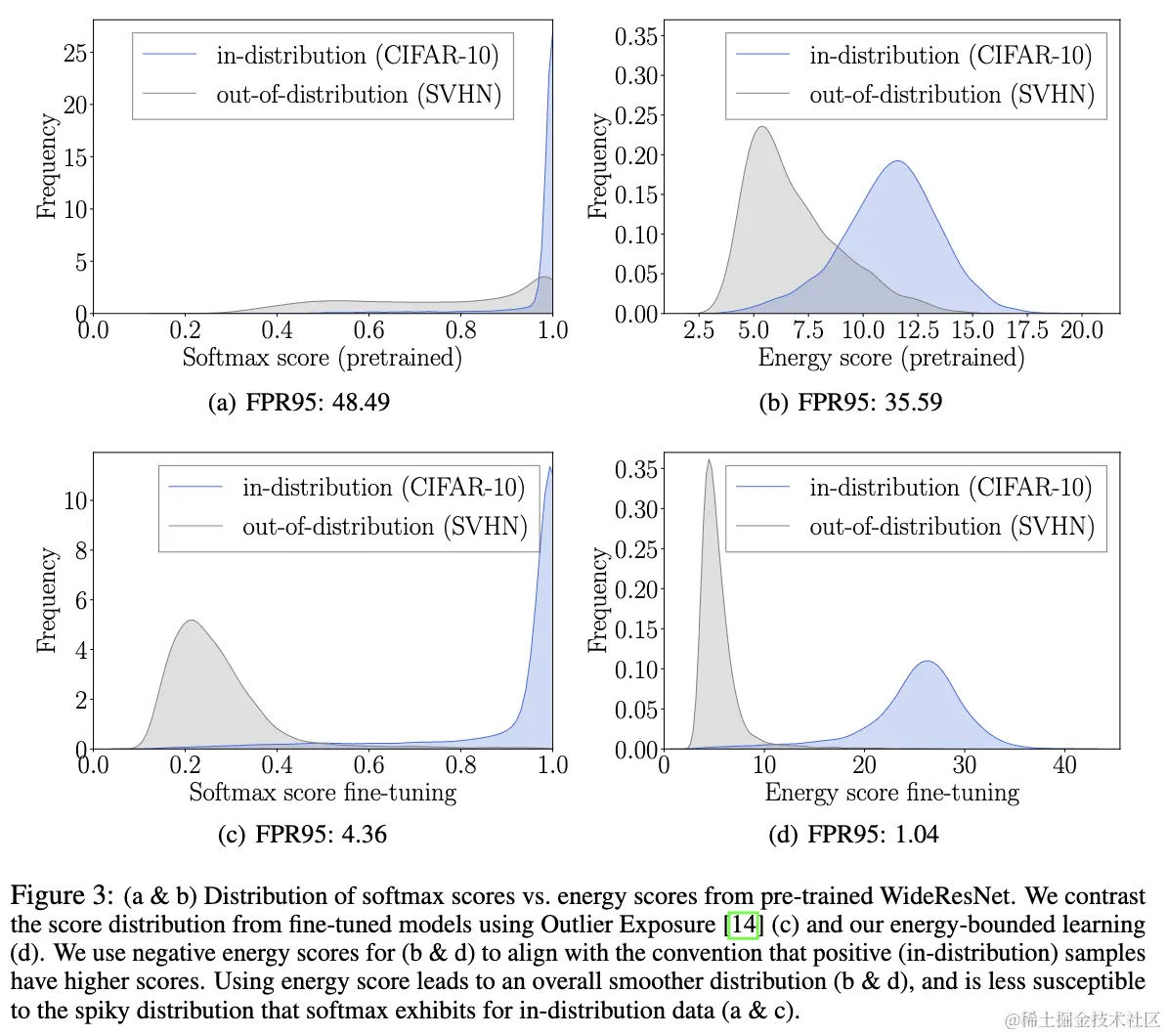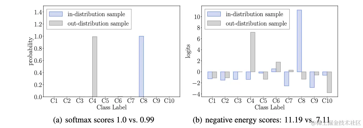 从上述式子可以看出,softmax置信度的对数实际上是free energy的特例,先将每个energy减去最大的energy进行偏移(shift),再进行free energy的计算,导致置信度与输入的概率密度不匹配。随着训练的进行,通常会变高,而则变低,所以softmax是有偏评价函数,置信度也不适用于OOD检测。