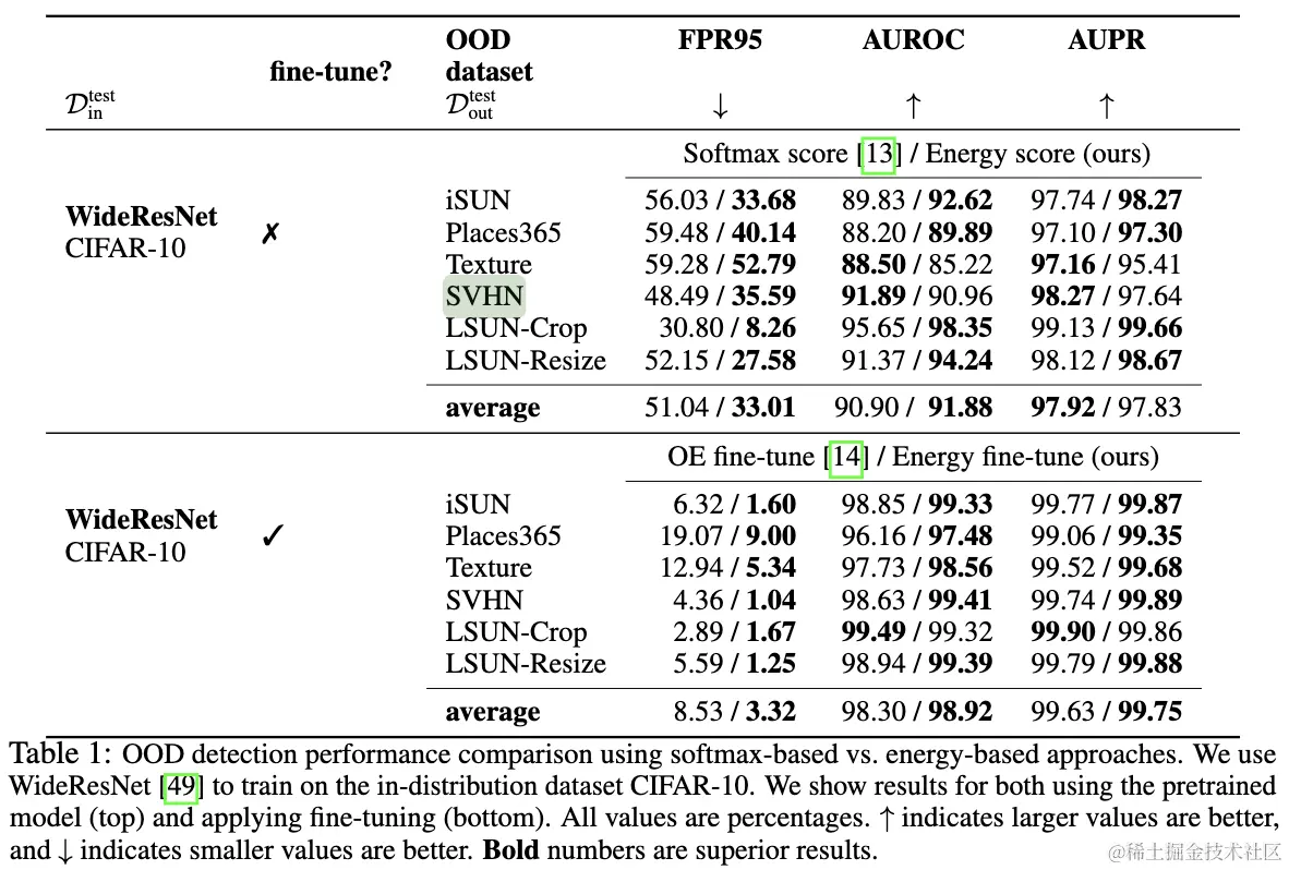 从结果可以看出,energy score比softmax score的表现要好,而经过fine-tuned之后,错误就很低了。